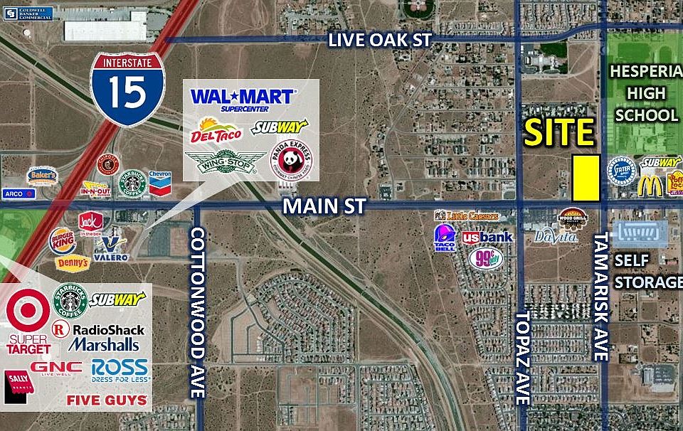 4.61 acres of prime commercial land situated on the corner of Main St and Tamarisk Ave in Hesperia. This location offers 331 feet of frontage on Hesperia's busiest thoroughfare, and an average daily traffic count over 40,000. With less than a 2 mile drive to the I-15 Freeway, this location is perfect for capturing commuter traffic. Property is located near the new Walmart Supercenter and the High Desert Gateway, including stores such as Super Target, GNC, RadioShack, Marshalls, Ross, and Sally's Beauty Supply. Surrounding businesses include Stater Brothers, Xpress Car Wash, DaVita Dialysis Center, and 99 Cent Only Store. Nearby eateries include El Pollo Loco, McDonalds, Subway, Taco Bell, Pizza Factory, Wood Grill Buffet, and many others. Property is zoned Neighborhood Commercial, allowing for a wide range of businesses which provide immediate day-to-day convenience shopping and services for the residents of nearby neighborhoods. All utilities are available at site.