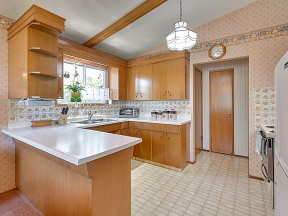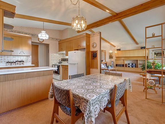 Wooden beamsU-shaped kitchenNatural lightCozy basementBig fully fenced backyardDetached garageCovered patio area