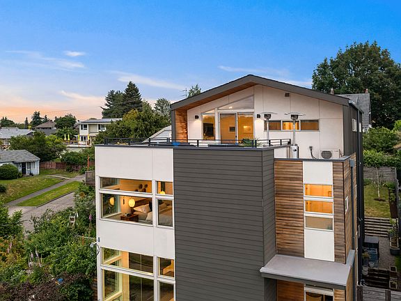 4-bed, 3.5-bath Madrona abode is contemporary elegance defined. Stunning architectural details: 12-foot-tall ceilings, walls of windows that welcome in bright sunlight and dynamic level changes. Beautiful hardwood floors & recessed lighting. Living room is perfect for entertaining with modern fireplace and gorgeous views. Spacious kitchen features quartz counters + 12-foot island, stainless steel appliances and Canyon Creek cabinetry. Relaxation + style in primary suite with dual custom closets + en-suite with deep standing tub, double sinks and heated floors. Top level features full wet bar and bath. Views of Seattle skyline and Madison Valley from rooftop. Grassy, fully-fenced backyard. 2-car garage. Beautiful Hot Tub. Restaurants, shops and waterfront parks minutes away.
