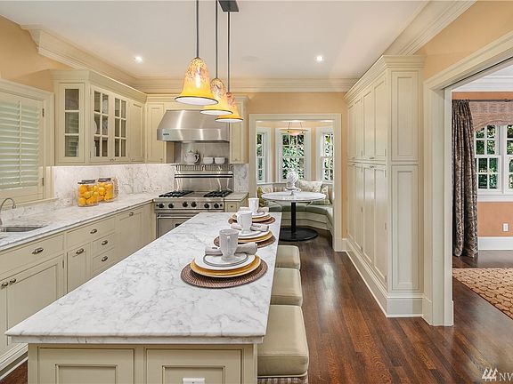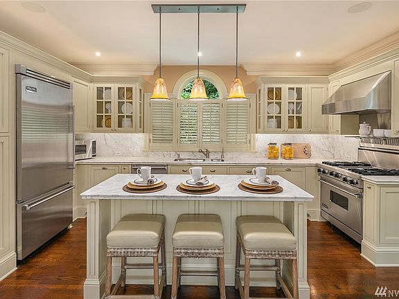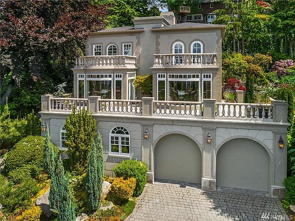This stunning home offers excellent indoor/outdoor living with sophisticated interiors and balustrade-lined balconies, all w/ sparkling Sound views. Kitchen offers marble countertops, Viking appliances, and breakfast nook. Space to entertain in formal dining room and living room; office offers wet bar. 5 bedrooms, including oversized master suite. Basement w/ MIL unit plus movie screen. Gated driveway, alarm system, security cameras, and attached 2-car garage. Located near Kerry Park.