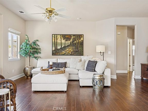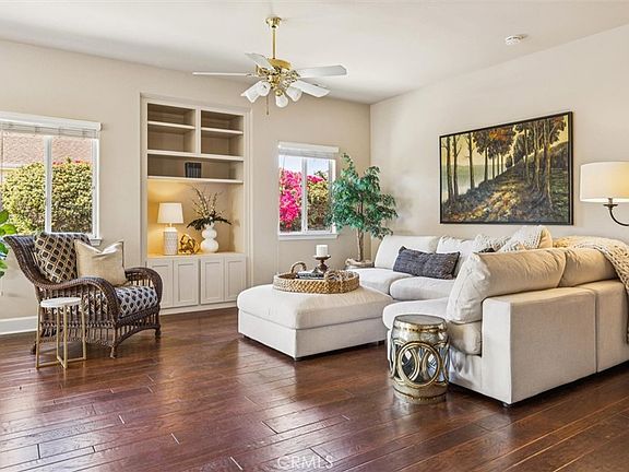 The inviting living area features engineered hard wood floors and a built-in entertainment cabinet, seamlessly connecting to the adjacent dining area. A sliding glass door leads to the beautifully landscaped backyard and patio—perfect for relaxing or entertaining guests.
