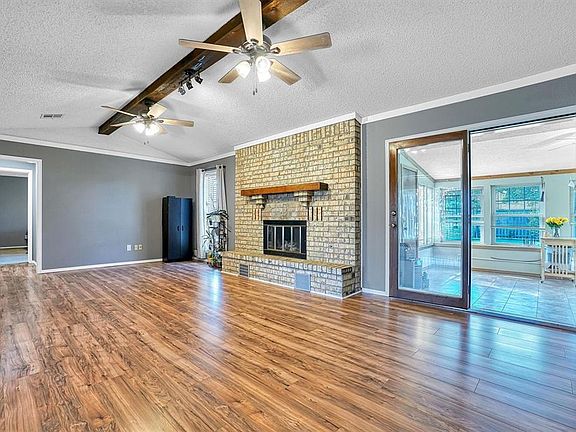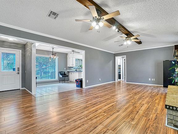 Check out this sweet, 3 Bedroom, 2 full bathroom house on a large lot with mature trees! The entry welcomes you with a large concrete patio, perfect for porch sittin’ and plants! The door opens to a spacious floor plan, laminate flooring runs through the living spaces and hallways with a statement gas log fireplace to anchor the room with vaulted ceilings and wood beams. The dining/kitchen area is bright with white cabinets, newer appliances, solid surface counter tops with ample prep space. They split plan gives you a large primary with on suite bathroom on one side of the house, with guest side off the entry with two large bedrooms, great closet space and a hall bathroom. The bonus area thru the living space is the multi use Florida room! A great size back yard also features a big workshop with a garage door access and electrical. House also comes with RO and Water Softener systems. Call today for a private showing!