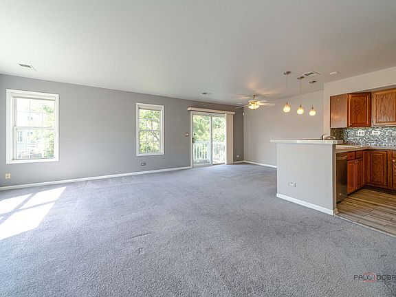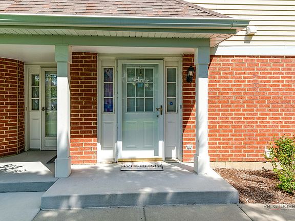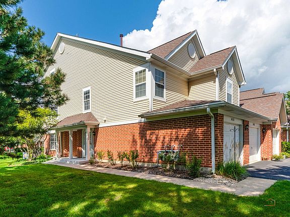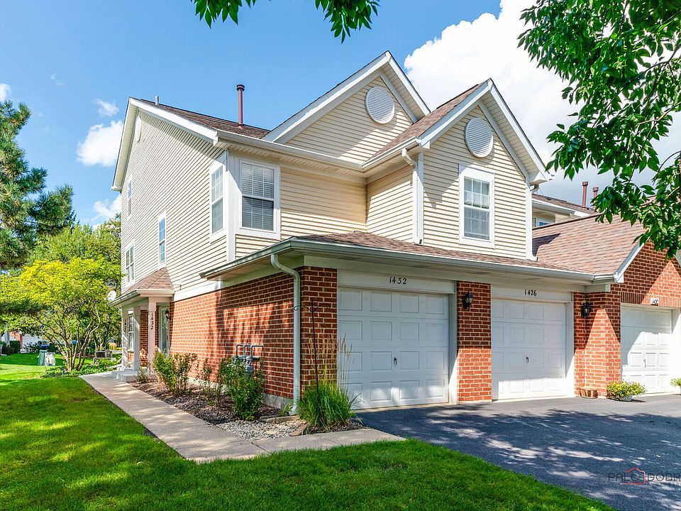 This beautifully maintained end-unit townhome offers 2 bedrooms, 2.5 bathrooms, and an attached 1-car garage. Step into the ceramic-tiled foyer and head upstairs to an open-concept main level, featuring a peninsula kitchen with oak cabinetry, quartz countertops, pantry closet, pendant lighting, ceramic tile backsplash, and plank-style tile flooring. The dining area opens to a private balcony with serene courtyard views, while the spacious living room is filled with natural light from windows on two walls, offering views of mature trees. Upstairs, the private level features two generous bedrooms, with dual closets and each with its own en-suite bathroom. The entry level also includes a laundry/utility room and direct access to the attached garage. Conveniently located near I-390 and within walking distance of the Metra station, this home is perfect for commuters. You'll also enjoy proximity to restaurants, shopping, forest preserves, and golf courses.