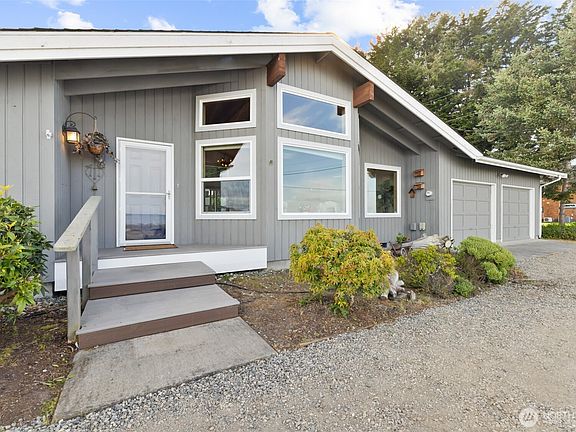 Stunning ocean front property on 1.36 acres! Step out to your own private beach and tidelands. Large picture windows allow lots of natural light as well as breathtaking ocean views of the strait. Open concept kitchen, dining and living room. Vaulted ceilings. Kitchen has lots of cabinets and counter space. Large laundry room with sink. Ample closet storage. Enjoy the amazing mountain views from the spacious back deck. Lovely garden space, patio, fruit trees and outbuilding. Over-sized garage with storage. Kayaking, hiking, biking and walks on the beach! Just minutes from town. Your private oasis awaits!