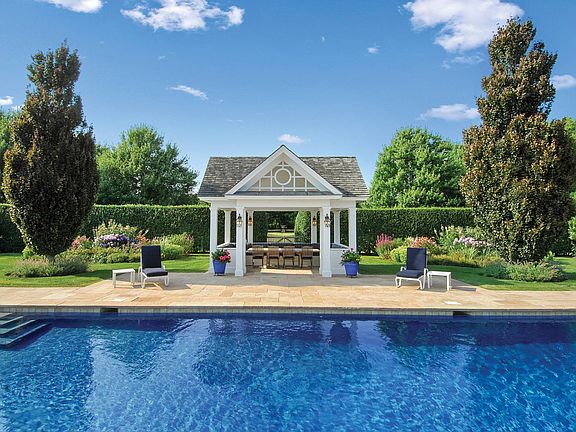 Rental Registration #: RP250637 Sun-filled four bedroom home on five glorious acres available for two or three-week rentals this summer. Totally private property has manicured English Herb Garden, perennial flower beds, sweeping lawns, and an orchard. There is an oversized 50' heated gunite pool and pool pavilion. The house has a huge back porch, covered side porches and balconies off every room. The living room has French doors on two sides and a fireplace. There is formal dining room, large eat-in gourmet kitchen, three fireplaces and three marble baths. This comfortable, lovely home is tastefully decorated and impeccably maintained. Located in Bridgehampton horse country and near the best vineyards and beaches.