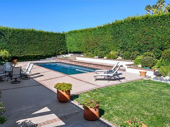 Enjoy the casual Palos Verdes lifestyle in this custom California contemporary home situated on a large corner lot with beautiful ocean views. Atrium like foyer welcomes you into the spacious five-bedroom 4.5-bathroom house. French doors bring into view the pool, patio and garden beyond as you enter the home. Vaulted plank wood ceilinged living room and dining room situated to the left of the entry separated by a limestone fireplace. Floor to Ceiling windows and glass doors open onto a long deck with views of the sparkling Pacific Ocean and the glorious sunsets. Light-colored hardwood floors extend through the living and dining area into the kitchen. Custom cabinetry with stone counters, a large center island with prep sink, top of the line appliances. Room for a large table and stools at the breakfast bar; convenient direct access to patio and pool for entertaining. Beyond the kitchen is the family room with a fireplace and doors to the yard. A private bedroom and bath complete that wing. Off to the right of the entry is an office and sprawling bedroom wing. Extra wide hallways lead to the master suite with ocean view. Enjoy the spa-like bath room with soaking tub, large shower and dual vanities; and adjacent walk-in closet. Three additional bedrooms and two bathrooms as well a well-organized laundry and lots of storage. Extra deep three car garage has abundant storage. Patio and pool area are private and spacious and there is a grove of fruit trees on the property.