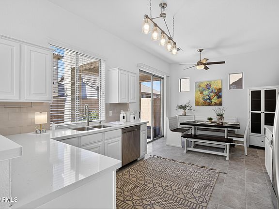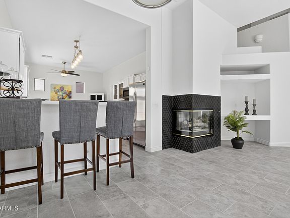 Discover this truly move-in-ready, highly upgraded home set on a desirable corner lot in the gated Villagio enclave within Palm Valley. Meticulously maintained, this home offers 3 bedrooms, 3 baths, 1,655sqft of living space, and a prime location just a half-mile from the Wigwam Resort, with convenient access to I-10 and the Loop 303. Step inside to new interior paint, newly laid carpet in bdrms, and refinished white kitchen cabinets topped with brand-new quartz countertops. The functional layout features a bdrm and full bath on the first floor, plus two bdrms upstairs, including the master suite with a gorgeous new walk-in shower, double upgraded sinks, and a walk-in closet. All bathrooms were fully remodeled with quartz counters, tile surrounds, and sleek vanities. You'll also appreciate the new lighting, ceiling fans in all rooms, a tiled fireplace surround in the living room, a new drip irrigation system, an updated garage door with opener, a newly painted garage, and updated closet doors and mirrors. Outdoors, the front entry has been freshly enhanced with small palms on each side and a new patio screen door. The landscaping and drip system are current and low-maintenance, and the included security system offers peace of mind. The washer, dryer, and refrigerator, and the charming kitchen table with matching cabinet (nook-style seating) will convey with the home. This home truly reflects the highest level of care and craftsmanship and is ready for its next owner. With a highly desirable location, great schools, golf-course proximity, and access to shopping and dining, this one won't last long.