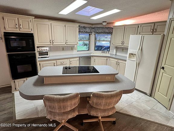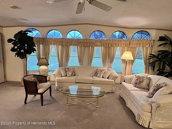 This spacious home features 2-bedroom 2 bathroom with a den. It is located on a lot in a half. The home has a double driveway. It has been freshly painted outside. It is located on the golf course of the 7th fairway in the Beautiful Brookridge community. It has a golf cart garage to make it easy for you to store your golf cart and ride right out to the golf course. When you walk in your greeted with the den and a back porch that is screened and looks out onto the golf course. Off that is a dining room with a wet bar, and a large kitchen. The kitchen has an island in the middle. Towards the front of the home is the living room with lots of windows for natural light. It has an inside laundry room. You can access the bathroom and guest bedroom off the laundry room or dining area. The master is very large with a bathroom that has a large, jetted tub and stand-up shower. It also has a private toilet. It has double vanity in the master. Both rooms have big walk-in closets. The home has partial texture walls. You won't want to miss out on this beauty. Home also comes mostly furnished.Come down and enjoy the sun and play some golf in a 55+ community where you own your own land!