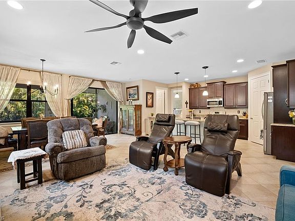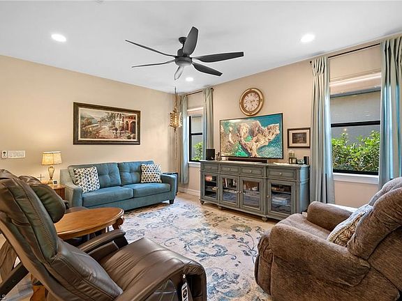 This impeccably maintained single-story residence, constructed in 2017, boasts three bedrooms and two baths. The heart of the home is its inviting open-concept layout, seamlessly connecting the kitchen, family room, and dining area—an ideal setup for hosting gatherings and socializing. In the living area, a built-in Arlington box accommodates a television, enhancing entertainment options. The gourmet kitchen is a chef's delight, featuring 42” cherry cabinets with raised panel doors, under cabinet lighting, and a custom decorative tile backsplash. Upgraded appliances and customized ELFA shelving in all closets, including the generously sized walk-in kitchen pantry, enhance the kitchen's functionality. A charming nook tucked away in the kitchen area showcases a solid wood wine rack and matching masonry work, complementing the quartz countertop. Towards the front of the home, two bedrooms or an optional office space share a full bathroom with ample closet space. Meanwhile, the master suite located at the rear of the home offers a tranquil retreat, complete with a double vanity and water closet. The master suite also boasts two generously sized walk-in closets with adjustable ELFA shelving and drawers, ensuring ample storage space. Elegant design touches abound throughout the home, including 8' doors, 5 1/4” baseboards, wood window sills, and custom Levelor blinds adorning all windows. Tuscany Pointe stands as a picturesque gated community nestled in the vibrant city of Naples. Its charming allure is highlighted by single-family homes adorned with pavers on every driveway and surrounded by lush tropical landscaping. Convenience is key in this community, with its prime location offering easy access to I-75 and placing Vanderbilt Beach within a mere 20-minute drive. Additionally, residents are just 7 miles away from the bustling shopping and dining hub of MERCATO, ensuring a wealth of entertainment and amenities right at their fingertips.