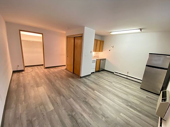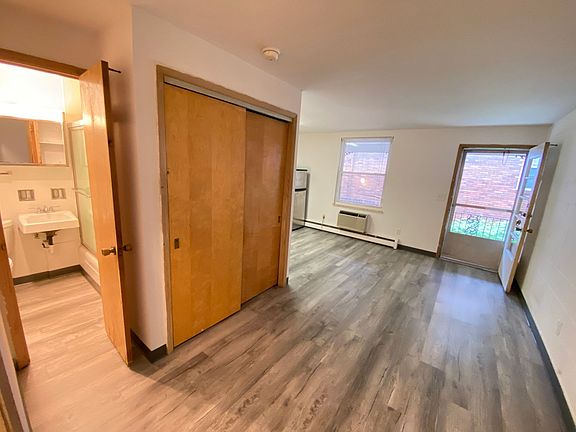 It features an efficiency-sized kitchen equipped with a built in microwave, stainless steel dishwasher and refrigerator. Additionally, there is a window air conditioner, a washer/dryer on-site and off-street parking available for purchase.