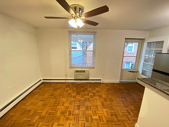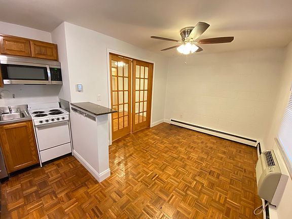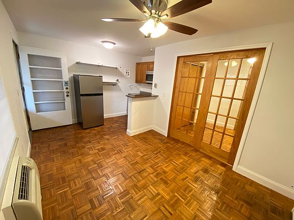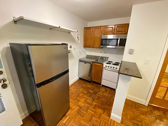 It features an efficiency-sized kitchen equipped with a built in microwave, stainless steel dishwasher and refrigerator. Additionally, there is a window air conditioner, a washer and dryer on-site and off-street parking available for purchase.