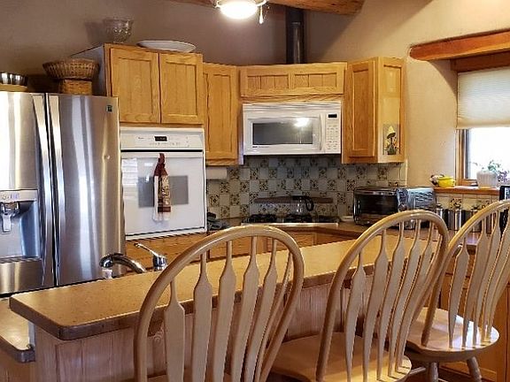 In the heart of it all, location style and a private oasis is waiting for you to enjoy over a dozen fruit trees, berry bushes and gardens. Mature landscaping offers a cool escape in the summer. 3 yards all privately fenced with views of the Taos mountains and valley create a perfect space for safe and happy dogs. Lots of room this 2629 sq ft home features 2 baths, 3 bedrooms, office and large family game/rec room plus 2 car garage. Southwestern style is throughout; vigas, 2 kiva fireplaces, saltillo tile, and bancos. The floor plan is split separating the master suite from the 2 bedrooms and office with a kiva. Great room includes a wet bar, opens to the private lush yard and has a kiva to make those winter nights cozy. Kitchen and dining room is divide by a large island for meal prep and meals on the run. Large pantry. Weimer location is set in the foothills of the mountains just 3 min from Taos' medical complex and hospital. A short 4 mile drive takes you to downtown Taos and historic plaza area, shopping, entertainment, fine dining and all your in-town needs, for outdoor recreation and just a mile from the Carson National Forest. The foot hills trails will lend you to biking, hiking or horseback riding, Big skies, privacy and lush on 1 acre.