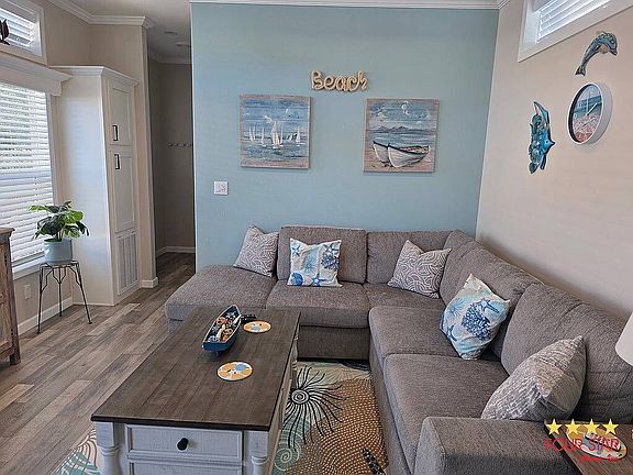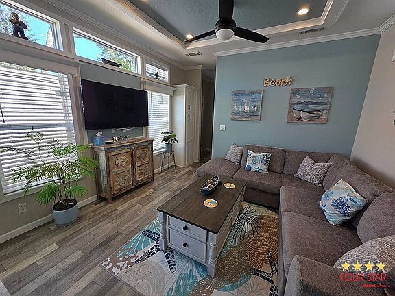 This gorgeous park model home will quickly become your favorite getaway! Located in the upscale gated community of Sunkissed RV in Summerfield, you will enjoy an active Florida lifestyle with pickleball courts, shuffleboard, bocce, a sparkling pool, relaxing hot tub, and a poolside Tiki Hut for socializing and cooling off with friends. Whether you are seeking a winter retreat or year-round enjoyment, this home truly has it all. Step inside through the screened-in porch (10x13), beautifully furnished with a TV, electric fireplace, and comfortable wooden seating??????????????????perfect for entertaining guests or enjoying peaceful evenings. The open-concept interior features a stunning L-shaped kitchen with stainless steel appliances, including an induction/convection oven with air fryer, built-in microwave, dishwasher, refrigerator, and an island with pull-out stainless organizers for easy storage. The home also boasts Low-E windows with blinds and wooden valances, transom windows for extra natural light, and tasteful d????????cor throughout. The living room features mounted TV and tray ceiling with ceiling fan and the upgraded bathroom includes elegant shower doors, while the bedroom offers a sleep number bed, mounted TV, closet with barn doors, overhead cabinets, and built-in storage. Plumbing is available to add an inside washer and dryer if desired. Enjoy added privacy with a backyard that borders the communitys park fence, plus an 8x8 shed with loft storage for all your extras. There is even an outdoor receptacle for your golf cart or electric needs. This home truly stands out??????????????????beautifully maintained, fully equipped, and ready for you to move right in. Do not miss this opportunity to own a piece of paradise at Sunkissed RV!
