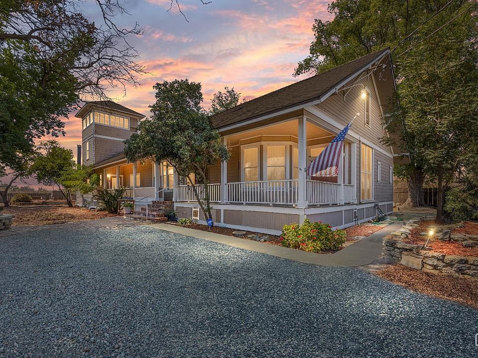 Step into a truly remarkable piece of history with this enchanting 1910 home, lovingly cared for by the same owner for over 60 years. Nestled among serene orchards, this property combines old-world charm with thoughtful modern updates the perfect blend of timeless character and modern comfort.From the moment you arrive, you'll notice the brand-new redwood fencing and siding, and a freshly resurfaced and repainted patio deck, perfect for relaxing evenings under the stars. Inside, soaring high ceilings, original craftsmanship, and stained-glass windows salvaged from a historic church tell a story of elegance and authenticity. A pocket door separates the living and dining rooms, while two fireplaces one a charming insert in the living room and the other a wood-burning fireplace in the den offer cozy spaces to gather.If you're seeking a one-of-a-kind property that radiates history, craftsmanship, and heart, surrounded by the tranquility of nature this is it!