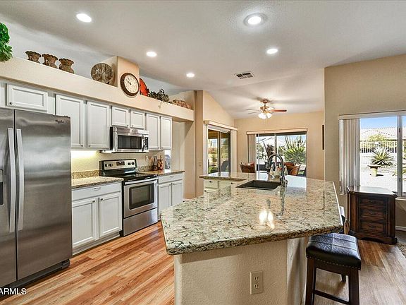 Welcome to this popular Carefree model in Sun City West! Roof underlayment replaced in 2025 and owned solar! You will love your low energy bills. Updated kitchen features large quartz counters, white cabinets and whirlpool stainless steel appliances--and opens to family room and eat-in kitchen. Modern LVP flooring for eaey living.Step outside to enjoy the extended patio with pavers, fresh maintenance-free turf and fully-fenced backyard. Professionally landscaped and exterior recently painted too. Sun City West offers 4 rec centers, 7 golf courses, pools, fitness centers, pickleball, tennis, dog parks, over 100 clubs, hobby studios, walking trails & resort-style living for active adults 55+.