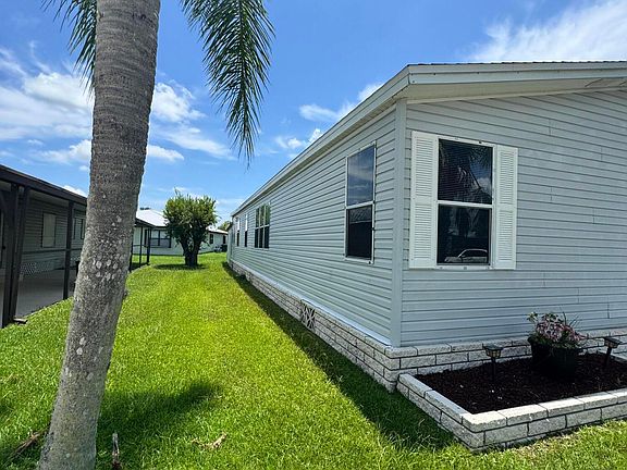 Lovely 3 bedroom 2 bath home in the desirable 55+community of Spanish Lakes Fairways. Home is on a very quite cal de sac. Spacious living room as well as oversized kitchen. Home has a screened in lania perfect for morning coffee or evening cocktails. Laminate and carpet flooring. Kitchen redone in 2015. kitchen features pull out shelves, large sink with window. coffee bar. Wiring in home redone in 2012. Dining room has built in shelves for added storage. Primary suite bathroom has dual sinks, built in vanity and build in shelves in bathroom. Roof is new 2025. A/C is 2022 Water heater was replaced in 2018. Lawn care and trash removal included in lot rent. 18 hole golf course included in lot rent. 2 pools, tennis, pickleball, bocce ball, shuffle board. club house and much more.