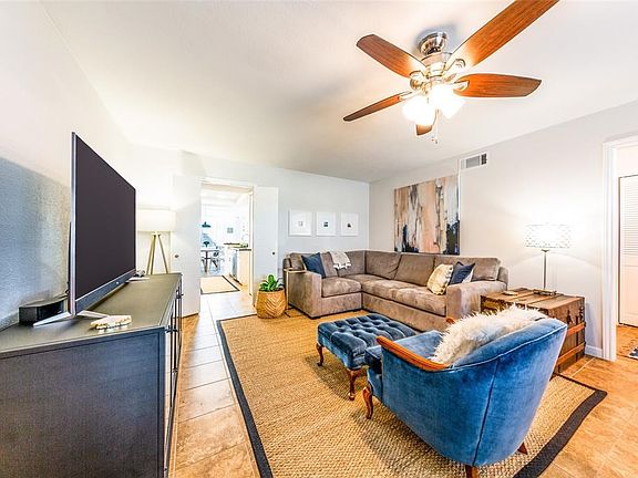 MOVE IN READY! Beautifully updated unit located in charming courtyard! Fresh paint throughout with popcorn ceilings removed, hvac replaced 2015. Large master with built-ins and walk in closet; updated kitchen and bathrooms with plenty of storage throughout unit. Wet bar gives plenty of extra space for entertaining. Kitchen opens to breakfast and den with woodturning fireplace. Television above fireplace included. Close to community playground, pools, tennis courts and wonderful neighbors. HOA dues include trash pick up, water/sewer, 24 hour patrol, on-site management office.