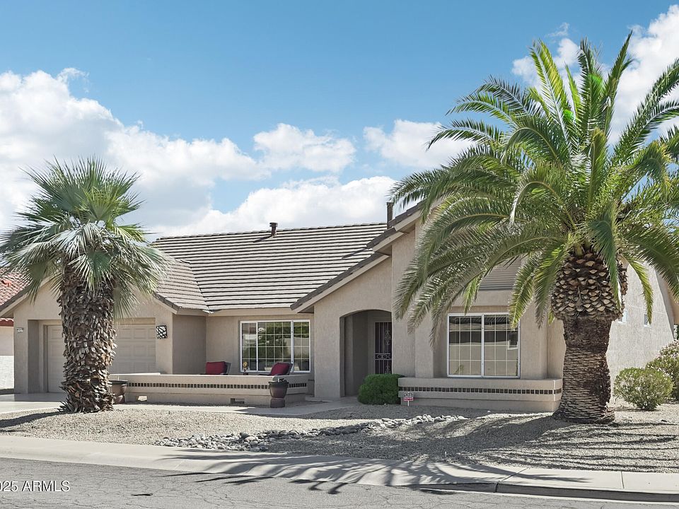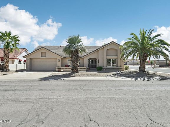 This beautifully remodeled and expanded Ventura model offers modern updates and an inviting layout. A recent remodel included expanding the kitchen to include a center island, wine cooler, granite countertops throughout the home, updated lighting, and a two-sided fireplace. Additional features include vaulted ceilings, dual sinks in the primary suite, indoor laundry, and paver patios in both the front and back yards—perfect for outdoor living. Major updates include a new HVAC system (2023), water heater (2020), and exterior paint (2022). Located adjacent to the Kuentz Recreation Center, this home offers unmatched convenience and access to Sun City West's premier amenities.