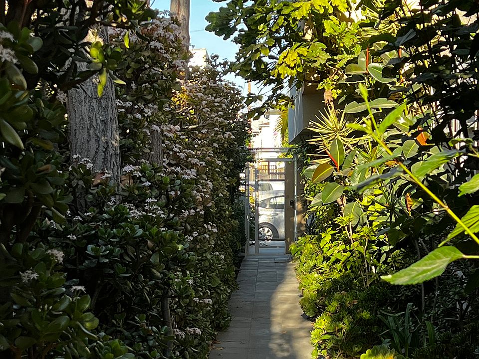 2 bedroom, 2 bath, approx 980 square feet - $2500/month. Cute building from the 1960s surrounded by impressive foliage, enclosed front patio, parlor/office, large living room, spacious eat-in kitchen with dishwasher, refrigerator and water filter, parking space in the covered carport accessible from the alley, cul de sac block with permit parking, laundry in the building, six unit building, walking distance to train, busses, grocery, coffee and a few restaurants. $2500 security deposit required. Building manager lives on site.