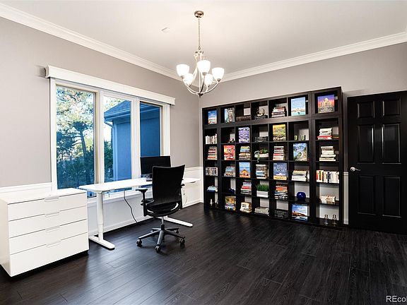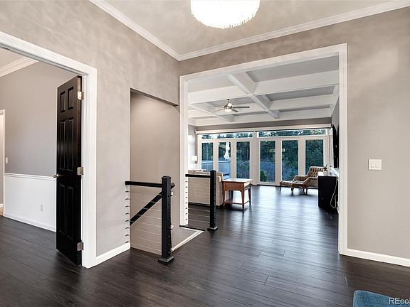Experience Larkspur living in the pines. This elegant custom ranch style home has been remodelled and updated- a full list is attached in the supplements. The entry foyer and main floor has striking vinyl laminate plank flooring which provides a perfect backdrop to the stunning forest views from the oversized floor to ceiling windows. The living room's 10-foot coffered ceiling sets the tone for the architecturally stunning floor plan. The white and gray accents create a contemporary yet warm ambiance. Off the foyer is a study/office/library with built in bookshelves. To the right is the primary suite with a gas log fireplace and mantle. The primary ensuite has been remodelled with quartz counters, walk-in shower, soaking tub, and floating cabinets with quartz counters. Off the living room is a great room with eat in kitchen and family room. The kitchen is capable of handling entertaining and family gatherings with double ovens, double dishwashers, new gunmental stainless refrigerator, microwave, and large island which holds the 5-burner cooktop. The adjacent family room has another gas log fireplace. Off the kitchen is a generous deck for outdoor living. Off the family room is a private guest suite with private bath, custom tiiled walk-in shower and floating cabinets with quartz counter. Down the stairs with new wire stair railing are two additional bedrooms sharing a remodeled bath also with quartz counters. The downstairs family room includes a wet bar, back yard access through a french door and plenty of room for pool table (included) and games. This home exudes charm and style with generous storage and built-ins. Welcome home!