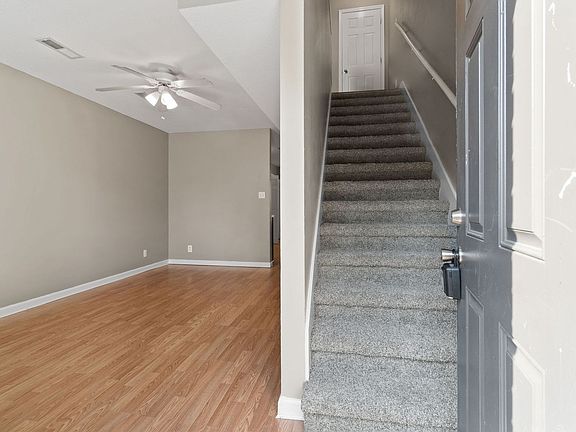 Half bathroomLarge single sink vanityBeautiful lvp flooringStairway leading upstairsTwo bedroomsWasher and dryerUtility closet
