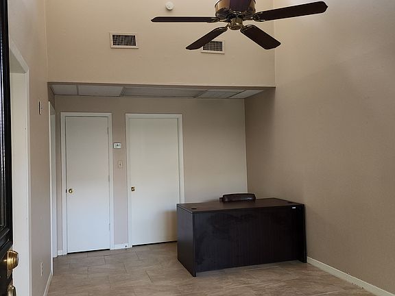 Upgrades include central A/C, ceiling fans, executive furniture, conference furnishings, and extensive cabinetry for organized storage. Rent includes water, sewer, trash, landscaping, and maintenance of common areas and building exterior.
