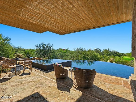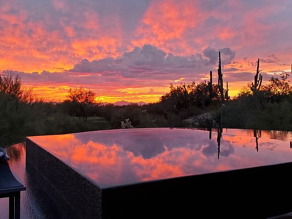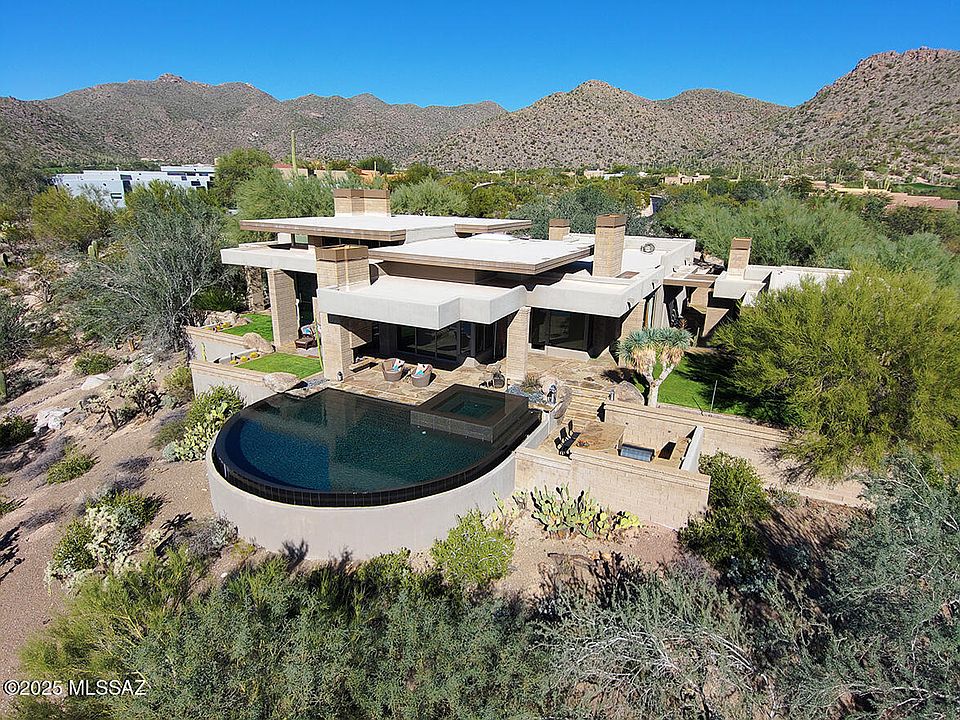Inspired by Frank Lloyd Wright's iconic ''Fallingwater,'' this architectural masterpiece overlooks the 12th green of the award-winning Gallery Golf Club-North. Designed for seamless indoor-outdoor living, great room features 12' telescoping glass doors framing breathtaking mountain ranges & spectacular sunsets. Enjoy resort-style amenities: infinity pool & spa, deep verandas, alfresco kitchen w/built-in BBQ & multiple fireplaces. Inside, hand-cut brown-hued flagstone floors, soaring 17' ceilings & exposed stone columns create timeless elegance. The state-of-the-art kitchen boasts premium appliances, while smart-home tech ensures modern convenience. A dramatic entry courtyard, separate guest casita w/ private patio, epoxy 3 car garage with Tesla charger. Spectacular!