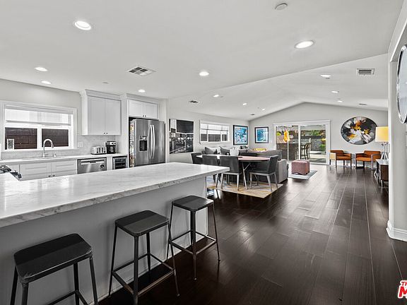 From the moment you arrive, the impeccable curb appeal sets the tone for what lies within this stunning Cape Cod inspired residence. Inside, soaring vaulted ceilings grace the expansive great room creating an open, airy ambiance. Designer touches abound, with recessed lighting and rich flooring that perfectly complement the elegant color palette and custom trim work. The entertainer's kitchen is a true showpiece, featuring honed Blanco Carrara marble countertops and backsplash, premium stainless steel appliances, and sleek recessed lighting. The primary bedroom suite offers spacious walk-in closets and a spa-inspired ensuite bathroom, adorned with Carrara marble tile, countertops, and exquisite basket-weaved floors. Two of the oversized bedrooms feature ample walk-in closets and a third bedroom is perfect for an office or guests with an en-suite bathroom. Functionality meets style in the large, separate laundry room, offering generous cabinetry and gas washer/dryer hookups. Enjoy the seamless blend of comfort and curb appeal with a professionally landscaped front yard. In the back yard, mature, low-maintenance landscaping surrounds a resort-style pool and spa featuring solar and gas heating for year-round enjoyment. Pool has a Baja shelf and a built-in bench around two sides allowing for comfort while cocktailing. A three-tier waterfall is highlighted by an infinite LED color lighting display. A gas fire pit and bench make for a cozy corner. Outdoor kitchen with gas grill and bar fridge, speakers and separate living area all covered by a pergola completes this ideal entertainer's backyard. Ideally situated with convenient access to the 101 and 405 freeways, this luxury residence places you at the heart of everything. Just minutes from iconic entertainment hubs including CBS Radford, Universal Studios, Disney Studios, and Warner Brothers, it's also near top-tier private schools such as Campbell Hall, Notre Dame, and Harvard-Westlake. Enjoy the best of Sherman Oaks with its vibrant array of fine dining, upscale boutiques, trendy bars, and premium grocery destinations including the new Whole Foods, Pavilions, and the flagship Ralphs. Nearby, you'll also find major hospitals and Los Angeles Valley College, offering both convenience and peace of mind.