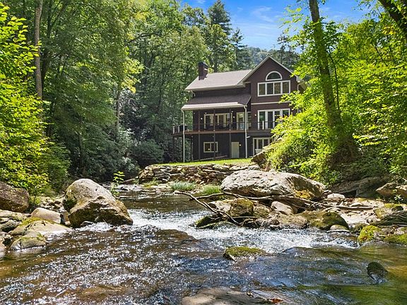 Creekside Luxury Retreat situated between Highlands and Franklin, this stunning custom home offers bold Buck Creek frontage wrapping around two sides, creating a private, serene setting. With over 4,200 sq ft of fully furnished luxury, this 3BR, 3BA, 2 half bath home is designed to impress. New composite decking on all porches. Each offers breathtaking views of the creek, hot tub, and firepit area. The light-filled great room boasts soaring wood beam ceilings, a stone wood-burning fireplace with gas starter, and hardwood floors. The chef's kitchen includes a Sub-Zero fridge, 6-burner gas range, granite, pantry, custom cedar cabinets, and breakfast bar. The adjacent dining area offers peaceful Creekside views. Upstairs are 2 ensuite bedrooms with vaulted ceilings, walk-in closets, and a private balcony in the primary suite. The lower level offers a large rec room, wet bar,1.5 baths, a walk-out terrace, and another bedroom, and a bonus room to sleep in, all with creek views. A 2-car garage, Starlink internet, security system, engineered driveway, and complete this one of a kind mountain paradise!
