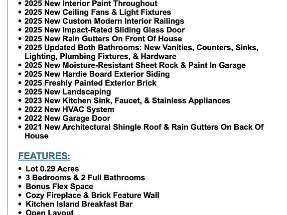 Beautifully updated 3 bedroom, 2 bath home on a spacious 0.29-acre lot in Gulf Breeze. Nearly every surface has been improved. Updates include new roof (2021), HVAC (2022), garage door (2022), Hardie Board siding and freshly painted exterior brick (2025), kitchen sink, faucet, and stainless steel appliances (2023), stainless refrigerator (2025), interior paint throughout, ceiling fans and lights (2025), moisture-resistant sheet rock and paint in garage (2025), custom modern interior railings (2025), impact-rated sliding glass door (2025), landscaping (2025), updated bathrooms with new vanities, sinks, lighting, plumbing fixtures, and hardware (2025), and rain gutters (back 2021 & front 2025). The kitchen offers maple wood cabinets, a custom island top, and a pantry. The living area features a cozy fireplace and tile floors throughout. A bonus flex space off the kitchen is perfect for an office, craft room, or drop zone. Enjoy the large open patio overlooking the privacy-fenced yard with sprinkler system on a well. Underground utilities and centrally located near Oriole Beach, Tiger Point, and just minutes from shopping, dining, parks, Oriole Beach Boat Ramp, A rated schools, and a short drive to Pensacola Beach or Navarre Beach.