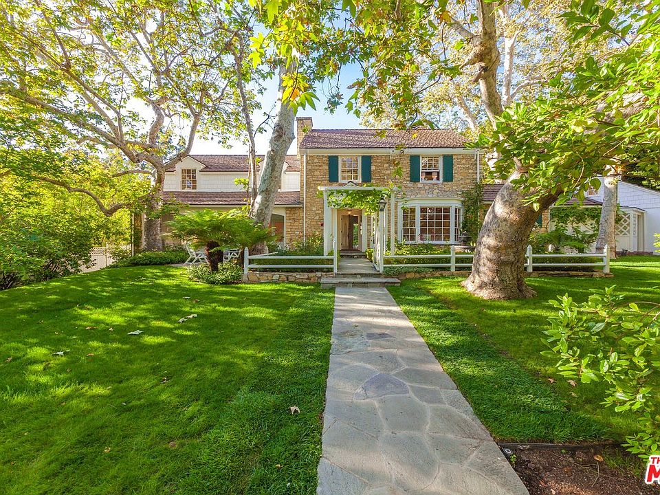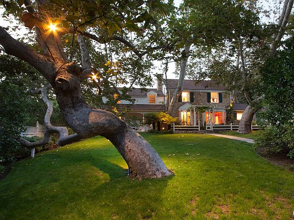 Situated on a level park-like corner lot this beautiful fully gated East Coast traditional home is surrounded by mature Sycamore trees and offers complete privacy. The 4 bedroom 4 bath main house, home to multiple celebrities, has great flow and features a large formal dining, family, and living room with access to the front and back courtyards. Hardwood floors throughout, the house features a gourmet kitchen, attached office, and huge bonus room. Multiple conversation areas accent the back courtyard leading to an enchanted guest house with fireplace and loft. Come feel the magic of this very special property.