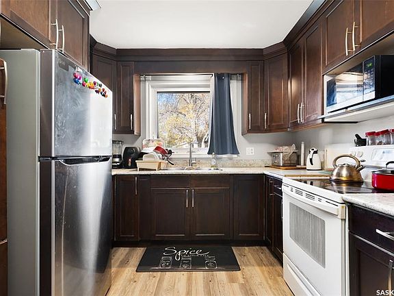 This solid duplex offers a fantastic opportunity for both homeowners and investors, featuring four bedrooms and two bathrooms. Unit is to be sold with attached property at 1437 Rupert Street (MLS #SK020175) Seller will only accepted offers for both sides. This side has been thoughtfully renovated, showcasing newer upstairs windows (excluding the living room), fresh paint throughout, updated fixtures, and high-quality laminate flooring. The kitchen and dining area have been opened up for a more modern flow, complemented by updated counters, cupboards, sink, and taps. The main four-piece bathroom includes a newer tub surround, while the basement boasts spray foam insulation, a generous family area, a large bedroom, a three-piece bath, laundry space, and an upgraded electrical panel. (Please note that basement bedroom window may not meet egress standards). The backyard is fully fenced, with a chain-link divider separating the two yards, and ample level parking adds to the convenience. Please contact your Realtor for more information on rental numbers or personal tour.