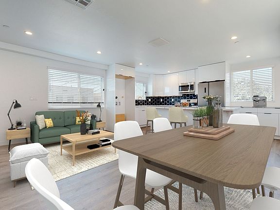 This 4-bedroom, 3.5-bath home features an open-concept living area with luxury vinyl plank flooring, recessed lighting, and ample natural light throughout. The sleek chef's kitchen boasts stainless steel appliances, glossy white cabinetry, a black hexagon-tile backsplash, and quartz countertops ideal for both entertaining and everyday living.