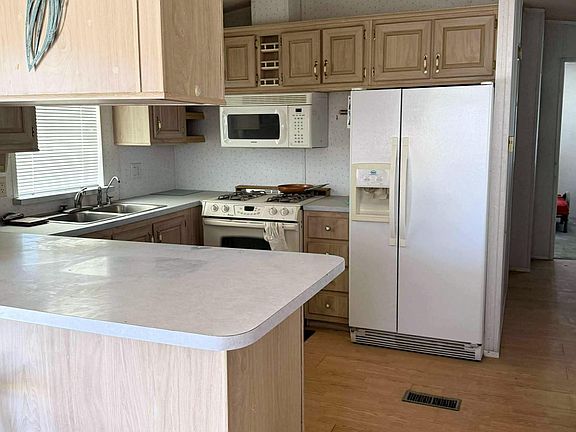 Spacious one bedroom, one full bath singlewide with fully enclosed AZ room for additional comfort and convenience. Interior features laminate wood flooring in kitchen, vaulted ceilings, gas range (propane), microwave, refrigerator, washer & dryer. RV access with full hookups. Storage shed along with extra storage in carport area. Located in desirable North Foothills location, this home offers plenty of potential!