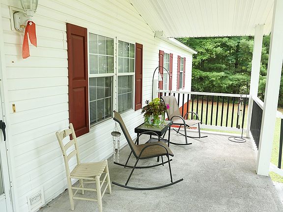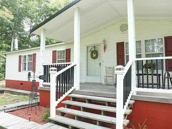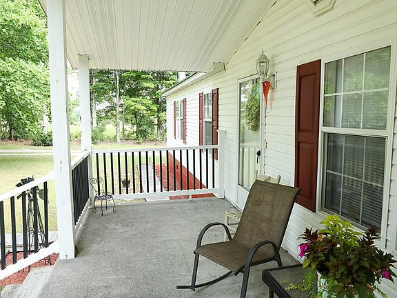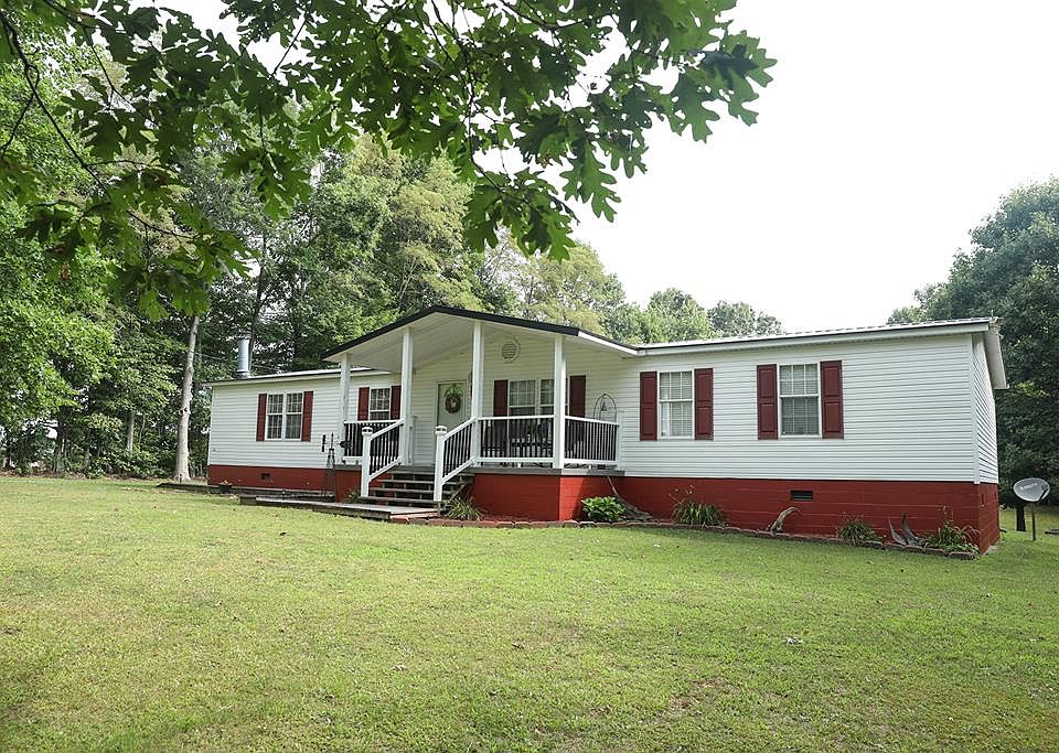 Very well kept doublewide on just over ONE ACRE and surrounded by mature hardwoods. Somewhat secluded setting! Three bedrooms and two full bath! Open floor plan with living room, dining room, and family room that is open to large eat-in kitchen with island. Master suite has HUGE walk-in closet and large private bath w/corner soaking tub and separate shower. Laundry/mud room! Very spacious covered front porch as well as covered rear porch and open patio. VERY LEVEL yard with lots of shade. Heat pump for heat and air. All kitchen appliances remain - refrigerator, electric range, dishwasher and microwave. Corner wood-burning fireplace in family room. Vinyl siding! Nice storage building and smaller used as playhouse.