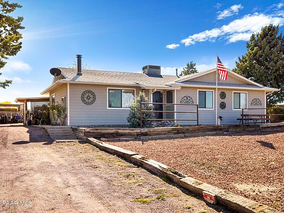 Situated in a beautiful setting with outstanding 270-degree long-distance mountain views that include the Mingus Mtns and the surrounding foothills vistas, this beautiful fully perimeter fenced horse property has outstanding curb appeal! The location is also just a short walk to El Charro Mexican Restaurant or a quick drive to shopping/dining in Chino Valley! The inside of the house has been remodeled and features an open/spacious great room concept single-level floorplan, a wood-burning stove with blower, ceiling fans, laminate flooring throughout the majority of the home, and raised panel interior doors. The kitchen features beautiful raised panel cabinetry with decorative glass fronts, crown molding, and a generous island with seating accommodating 4 to 6 guests for entertaining. Off the kitchen is an additional office/media/flex room. The master suite is spacious in size and the attached bath offers a custom dual vanity with a granite top, a tub/shower with a beautifully tiled surround. The guest bathroom has tile flooring, a raised height vanity, and a tub/shower combo with a tile surround. The guest bedrooms are generously sized. The laundry room has great functional storage and the front load washer/dryer, which convey with the home. The yard is beautifully landscaped with multiple RV parking locations-one with a full hook up and both with 30-amp service. The property is cross-fenced into two separate pastures, both on separate irrigation plus there is a separate dog yard. The party patio off the garage provides additional entertaining space. Additional amenities include recent exterior paint, a detached 2 car garage with an attached storage/hay shed/tack room, a fantastic producing well plus a 5000-gal storage tank, a 2-stall barn with turnouts, drill stem no climb fencing, and a well house that has great functional storage.