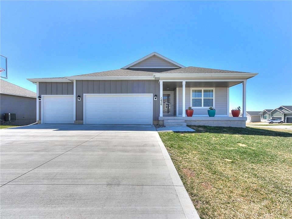 Better than new! This one owner, well-built home is ready for you. The airy ranch provides a single-level, open living space with 3 bedrooms and 2 baths. The main living area has solid surface flooring throughout for easy maintenance, and the kitchen is spacious with a large built-in island, gas range, stainless steel appliances, quartz counters and beautiful white shaker cabinets. The home features two large bedrooms located in the front and a third bedroom situated in the back for privacy, which includes a large walk-in closet and luxury bath. The entry from the garage has a conveniently located closet for coats and jackets. Unwind on the newly stamped and colored 20x27 ft concrete patio, excellent for entertaining and why not add a fire-pit and enjoy a cozy evening with the perfect company. The large, unfinished basement is ready for you to add a 4th and 5th bedroom and extra bathroom. Energy Star Efficient. Original 10- year transferrable structural warranty included. With the limited inventory for homes like this in Grimes, this one will go fast so schedule your showing with your favorite realtor today!
