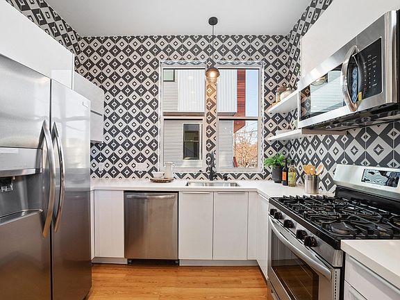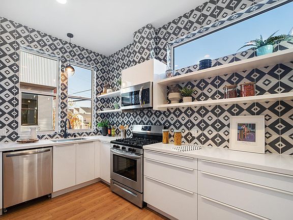 Ultra-modern kitchenOversized windowsStainless steel appliancesGleaming hardwood floorsAbundance of lightDesigner cabinetryIn-home washer and dryers