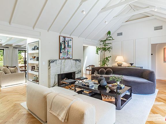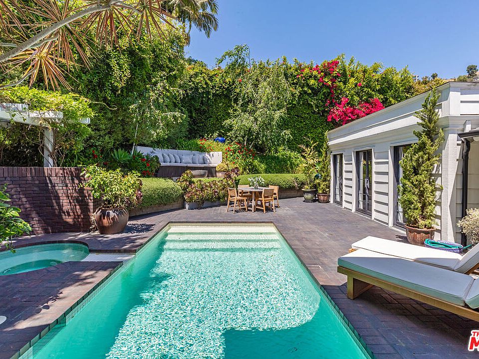 Charming lower Sunset Plaza jewel-box residence, originally envisioned by Robert Byrd AIA and thoughtfully reimagined by Bradley Adcock. Privately tucked away at the end of a cul-de-sac, the home sits behind a gated drive with a spacious motor court, offering serenity just minutes from the Sunset Strip. Inside, you will find refined details throughout - oak herringbone floors, French doors, picture windows filling the rooms with light, striking stonework, marble fireplaces, and inviting spaces ideal for entertaining. The main level boasts dual living rooms with soaring ceilings, an elevated formal dining area, a richly hued media room, and a bespoke bar. A spiral staircase from the curved kitchen descends to a hidden, prohibition-inspired wine cellar and tasting room. Occupying an entire floor, the primary suite impresses with 16-foot vaulted ceilings and a marble-clad bath overlooking the city. Outdoors, lush gardens surround the pool, spa, fire pit, and multiple sitting areas, creating a peaceful retreat. This one of a kind mini-compound offers a private oasis in the very heart of Los Angeles.