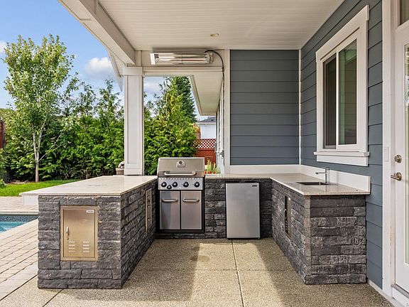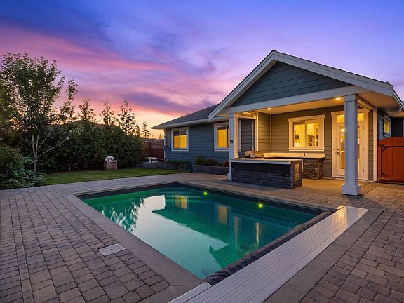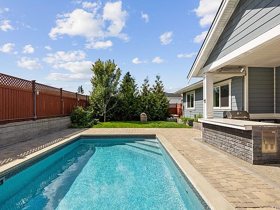 Designed with both family living and entertaining in mind, this stunning 4-bed, 3-bath home offers spacious functionality and luxurious finishes throughout. Whether you're a growing family or empty nesters looking for room to host guests, the versatile layout, including a large rec room, adapts perfectly to your needs. A level walkout from the main floor seamlessly connects the interior to the backyard featuring an in-ground pool and a fully equipped outdoor kitchen, making it ideal for summer BBQs and outdoor entertaining. High-end features include 9-foot ceilings on both levels, a striking 10-foot tray ceiling in the great room, quartz countertops, wide-plank engineered hardwood floors and picturesque mountain views. The 3-car garage provides ample space and storage. The primary suite offers a spacious walk-in closet with custom built-ins and plenty of natural light, while the luxurious ensuite boasts heated tile floors, a double vanity, deep soaker tub, & a tiled walk-in shower.