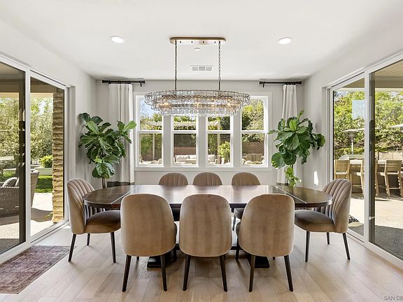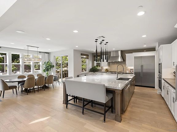 Located in the desirable Enclave community in Encinitas, this newer construction and beautifully-designed home offers a blend of luxury comfort and style. Built in 2019 on a spacious 1/3 acre lot, this former model home, featuring 5 bedrooms plus an office and an oversized loft, was thoughtfully crafted to maximize both indoor and outdoor living. The entryway welcomes you with 19-foot ceilings, hardwood flooring, and custom lighting throughout the open floor plan. Just off the entry is a guest room with an ensuite bath, as well as a separate well-appointed office with built-in cabinetry. The kitchen is equipped for entertaining with an oversized island, soft-close cabinets, Thermador stainless steel appliances, a six-burner cooktop, wine fridge, and quartzite countertops. The open-concept dining and family room features bi-fold glass doors that lead to an expansive outdoor space with a swim spa pool, raised Trex deck, fire pit, outdoor kitchen, and a generous grass yard. The main floor also features the primary suite with a spacious bathroom that includes dual sinks, a makeup vanity, large soaker tub, double shower heads, and an oversized walk-in closet. Upstairs, you'll find three additional bedrooms, a second laundry room, and a loft/bonus room complete with built-in cabinetry, speakers, and a pool table. Additional highlights include a three-car garage with a Tesla charger, fully paid solar. Conveniently located minutes from top-rated schools, trending dining, and picturesque beaches, this property is a fantastic opportunity in Encinitas.