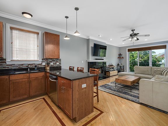 Spacious 2 Bed/2 Bath on Tree Lined Street in desirable West Wicker/Humboldt Park! This Home features an Open Floor Plan with a Great Flow. High Ceilings, Crown Molding, and Hardwood Floors Throughout. Large and Bright Living/Dining Room with Gas Fireplace and Sliding Glass Door to Juliet Balcony. Kitchen is complete with Stainless Steel Appliances, Granite Countertops, and Backsplash. King Sized Primary with Sliders to back Deck (also accessible from hall), Walk-in Closet w/ Custom Organizers, and a Stone Bath w/ Double Sink, Jetted Tub, and Separate Shower w/ Body Sprays. Unique "Mudroom" Area leads to Back Deck and Parking. Exterior, Gated Parking Space Additional Storage Included. Walking distance to the Blue Line, Metra, 606 and all of the Restaurants, Bars, and Shopping Division Street has to offer. Easy access to 90/94. Well run association with no specials planned or contemplated. All three units owner occupied. No rental restrictions.