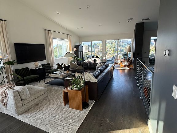 This home boasts an open floor plan on the main level with an oversized sectional, built-in stereo sound, multiple seating areas, and a dining area that seats 6-8. The open kitchen features an oversized island with seating for 3-4 with recent upgrades that include a Subzero wine fridge, separate beverage center, and Wolf microwave drawer. The main level also has access to an oversized terrace through its four sliding glass doors. The terrace is complete with planted trees, a table that seats 10, and two separate lounge areas to enjoy the sunsets over the mountains to the north and west.