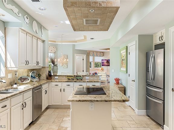 Enjoy a large chef’s kitchen with travertine flooring, granite countertops, marble tile backsplash, stainless steel appliances, and ample cabinet storage. The primary suite includes tray ceilings, walk-in closets, and a spa-like en-suite bath with dual vanities, soaking tub, and separate shower. The expansive screened lanai provides serene views – ideal for relaxing with a morning coffee or entertaining guests.
