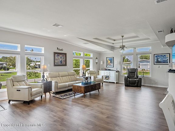 This home is a Show Stopper! Easily one of the best, if not THE Best Home in Brookridge 55+ guard gated community. Welcome to this magnificent 3-bedroom, 2-bathroom Triple Wide home with a golf cart garage nestled on a fenced corner lot with lots of parking! Don't miss the array of impressive features throughout this home. From the charming front porch to the elegant trey ceilings and crown molding, this residence offers a combination of style and functionality. Situated in a desirable location, this home is perfect for those seeking comfort, convenience, and a touch of luxury.