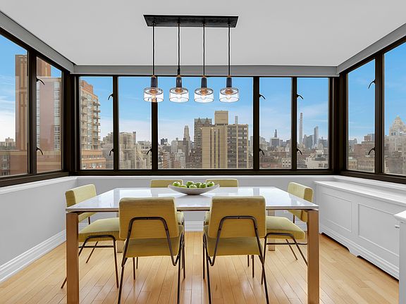 The dining area and kitchen enjoy breathtaking, unobstructed southern views stretching all the way to Billionaires' Row. The kitchen is equipped with top-of-the-line stainless steel appliances and Caesarstone countertops, and opens to an elegant, sun-flooded living room with built-in bookshelves and an adjacent east-facing balconyperfect for entertaining.