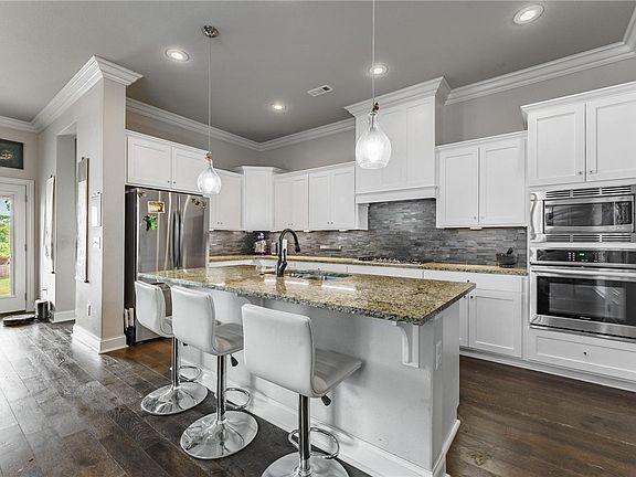 The heart of the home is the modern kitchen, complete with granite countertops, a large island for gathering, and a walk-in pantry for ample storage.