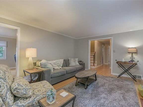 Wonderful brick cape with hardwood floors on lot with mature plantings. Front entry leads to living room with wood burning fireplace, a formal dining room, updated light filled kitchen; two bedrooms and a full bath. The upper floor has brand new paint and carpeting and a full bath as well as generous storage. The lower walkout level has a game room with gas fireplace; full bath; unfinished storage with laundry; one car integral garage. Huge picture window on lower level looks out to deck with awning; fenced rear yard and long driveway. House is an easy walk to the Village, schools, and is on the bus line.