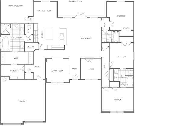 Large breakfast barDedicated officeOpen floor planFunctional laundry roomJack and jill bathroomVaulted beamed ceilingsLarge soaker tub