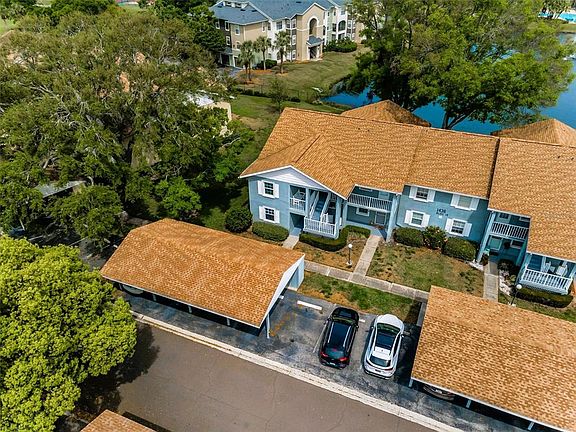 One or more photo(s) has been virtually staged. Welcome to Lake Tiffany in Dunedin! This charming 2-bedroom, 2-bathroom corner unit is located on the second floor and offers stunning lake views. Light and bright throughout, the home features an open floor plan with a well-designed split-bedroom layout. Both bedrooms boast spacious walk-in closets, with the primary closet providing convenient access panels to the shower waterline. Enjoy outdoor living with a generously sized front porch and a screened-in lanai overlooking Lake Tiffany. The interior has been recently painted, and the unit includes a carport with an additional storage closet. Lake Tiffany allows one pet up to 25 lbs. and is situated in a non-flood, non-evacuation zone. The monthly fee of $557 covers Frontier Fiber Optic Internet (streaming via a DirecTV box), community pool, exterior building and grounds maintenance, property management, water, trash, and sewer. Conveniently located just a short drive from Downtown Dunedin, this home offers comfort, functionality, and a prime location.
